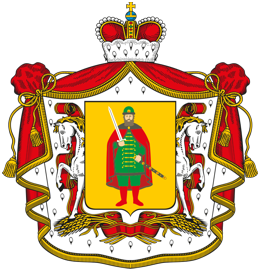 Рязань (старый герб). 23 ноября 2000 года в рисунок герба над щитом была добавлена шапка Мономаха. |